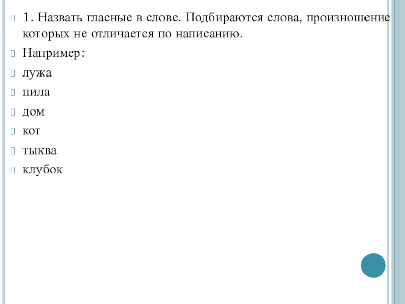Слайд 231. Назвать гласные в слове. Подбираются слова, произношение которых не отличается