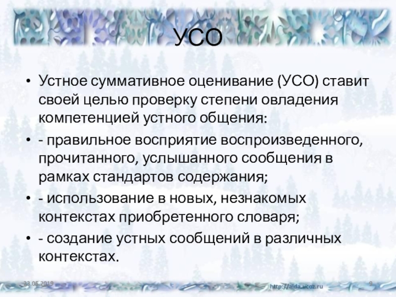 Устное суммативное оценивание (УСО) ставит своей целью проверку степени овладения компетенцией