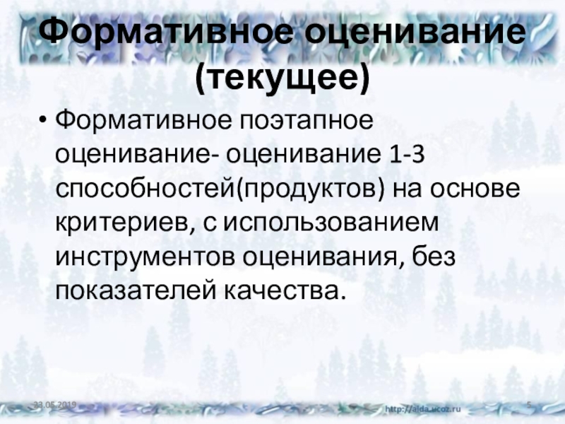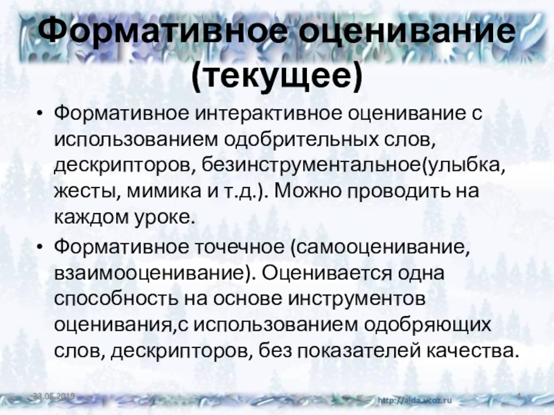 Формативное точечное (самооценивание, взаимооценивание). Оценивается одна способность на основе инструментов оценивания,с использованием одобряющих слов, дескрипторов, без показателей качества.