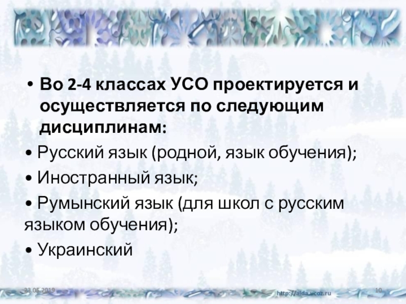 Слайд 10Во 2-4 классах УСО проектируется и осуществляется по следующим дисциплинам:
