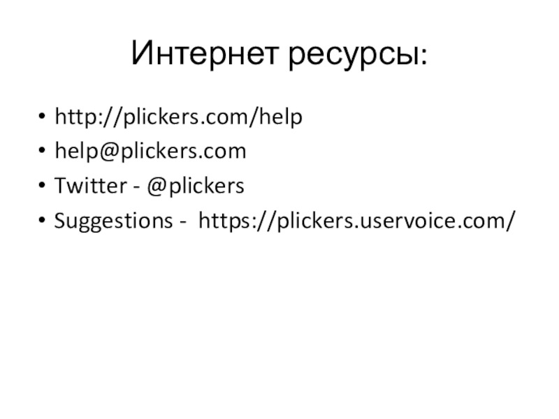 Интернет ресурсы:http://plickers.com/helphelp@plickers.comTwitter - @plickersSuggestions - https://plickers.uservoice.com/