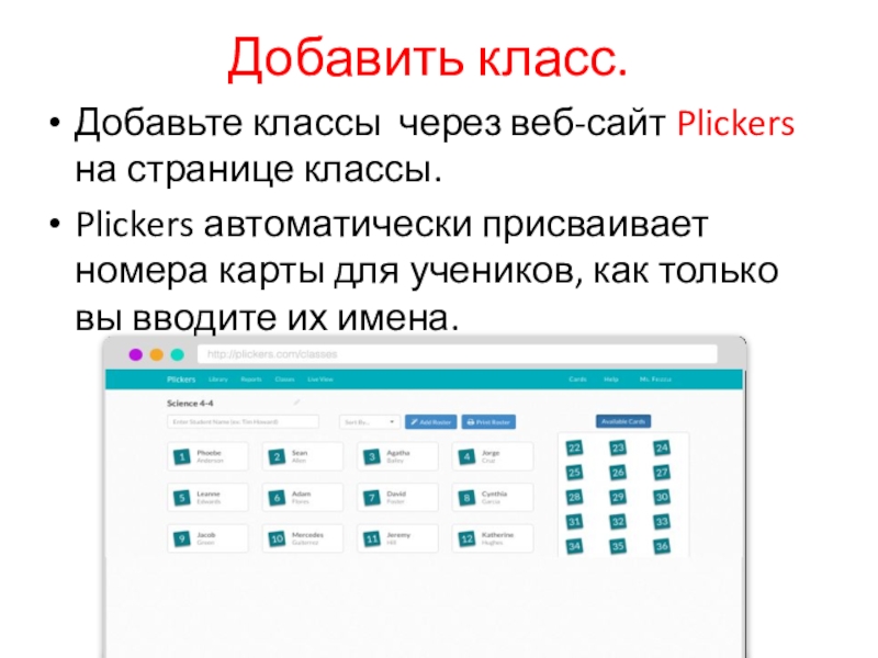Добавить класс.Добавьте классы через веб-сайт Plickers на странице классы.Plickers автоматически присваивает номера карты для учеников, как только