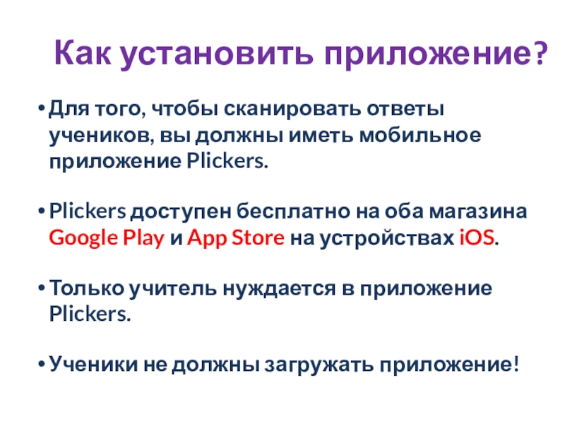 Как установить приложение?Для того, чтобы сканировать ответы учеников, вы должны иметь мобильное приложение Plickers. Plickers доступен бесплатно