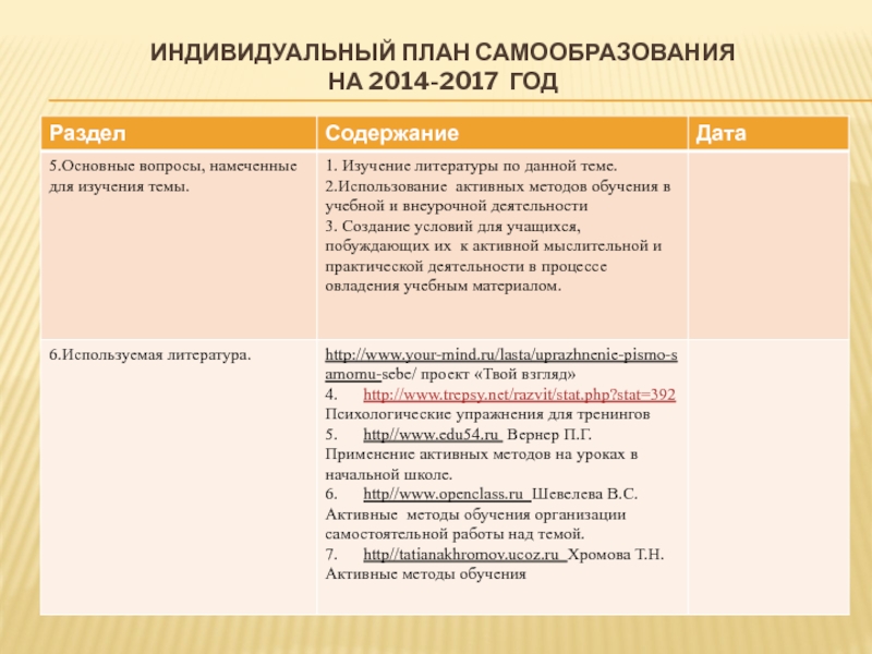 Слайд 5Индивидуальный план самообразования на 2014-2017 год