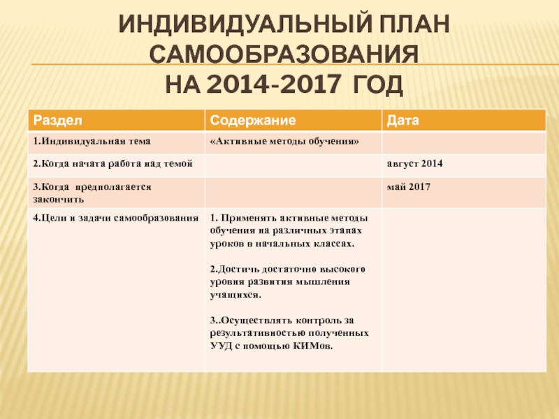 Слайд 4Индивидуальный план самообразования на 2014-2017 год