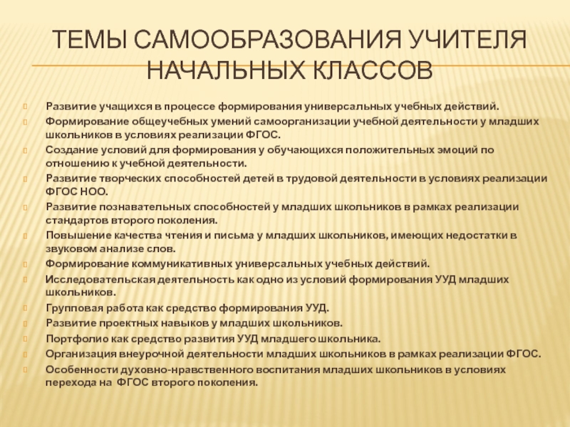 Темы самообразования учителя начальных классовРазвитие учащихся в процессе формирования универсальных учебных действий.Формирование общеучебных умений самоорганизации учебной деятельности