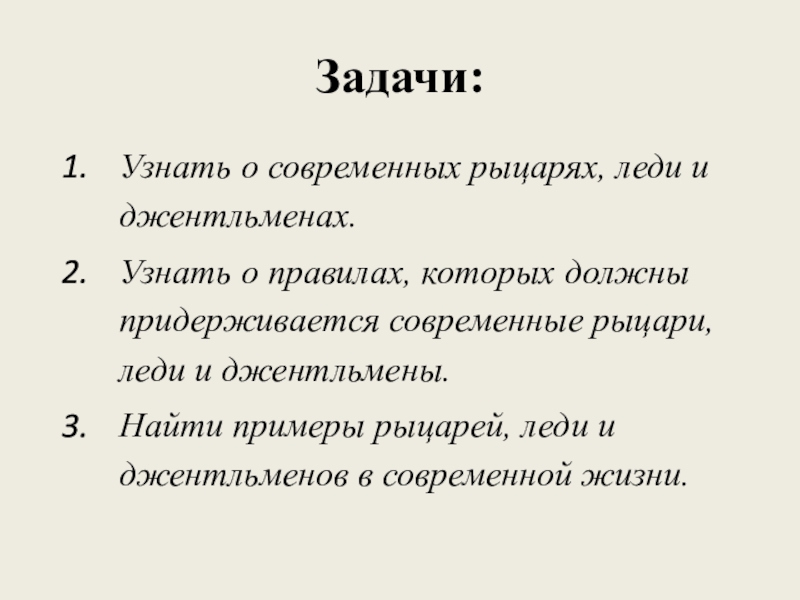 Задачи:Узнать о современных рыцарях, леди и джентльменах.Узнать о правилах, которых должны придерживается современные рыцари, леди и джентльмены.Найти