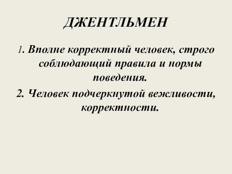 ДЖЕНТЛЬМЕН1. Вполне корректный человек, строго соблюдающий правила и нормы поведения.2. Человек подчеркнутой вежливости, корректности.