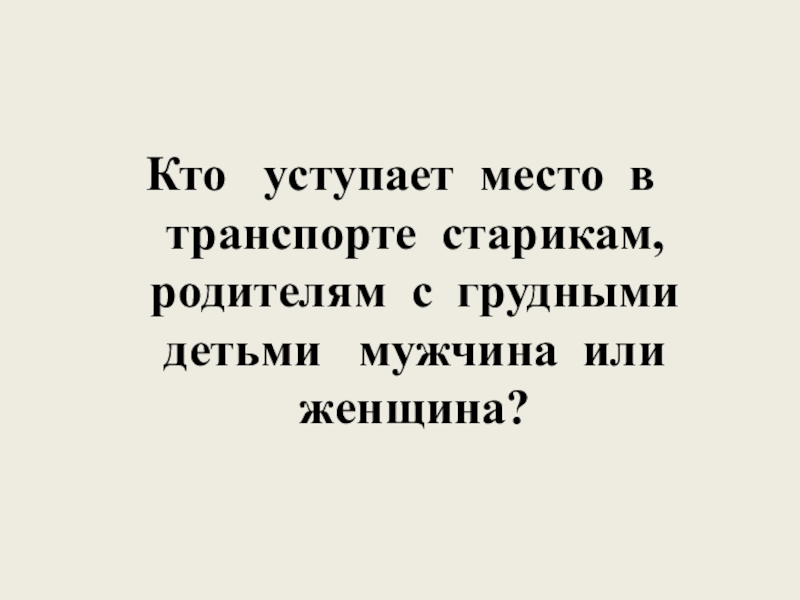 Кто  уступает место в транспорте старикам, родителям с грудными детьми  мужчина или женщина?