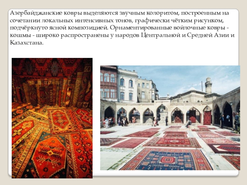 Слайд 5Азербайджанские ковры выделяются звучным колоритом, построенным на сочетании локальных интенсивных тонов,