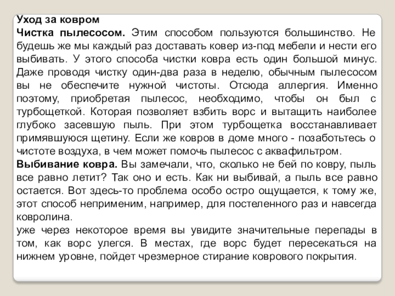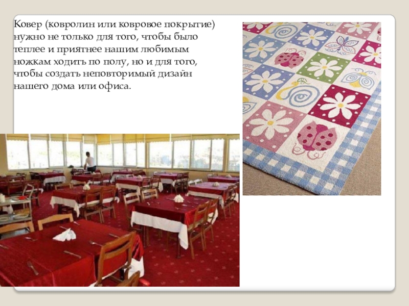 Слайд 7Ковер (ковролин или ковровое покрытие) нужно не только для того, чтобы