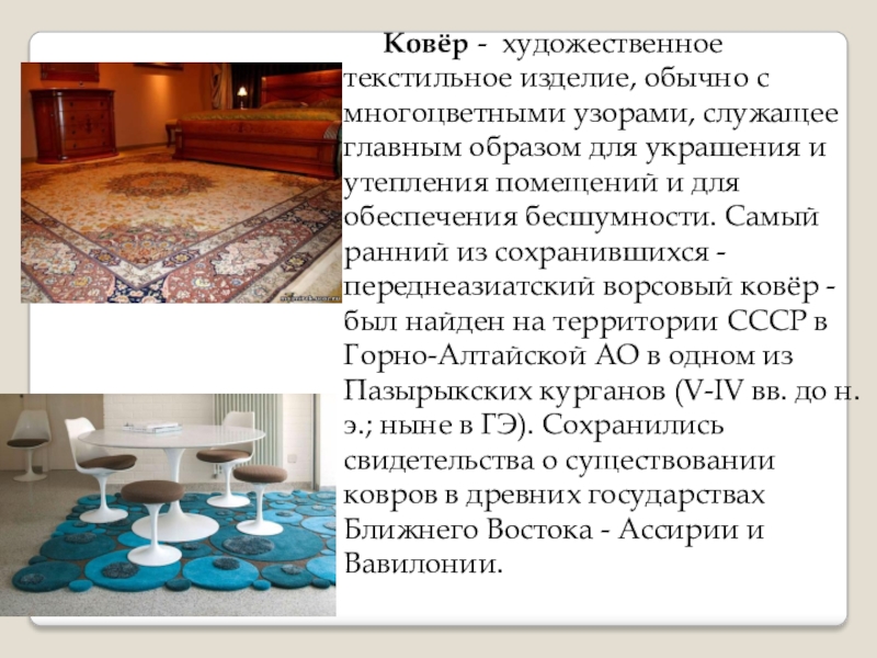 Ковёр -  художественное текстильное изделие, обычно с многоцветными узорами, служащее главным образом для украшения и утепления помещений и для обеспечения бесшумности. Самый ранний из сохранившихся - переднеазиатский ворсовый ковёр - был найден на территории СССР в