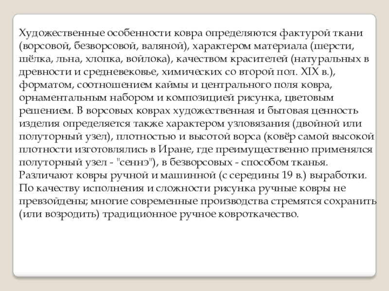 Слайд 3Художественные особенности ковра определяются фактурой ткани (ворсовой, безворсовой, валяной), характером материала