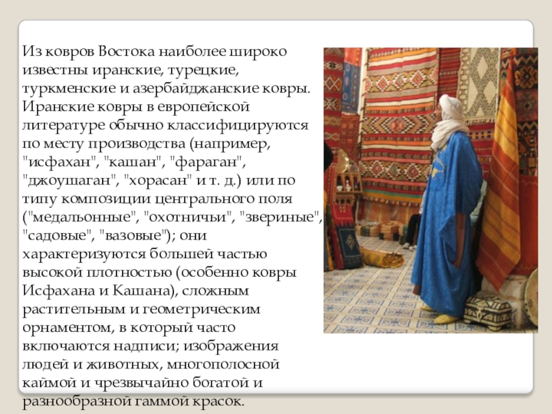 Слайд 4Из ковров Востока наиболее широко известны иранские, турецкие, туркменские и азербайджанские