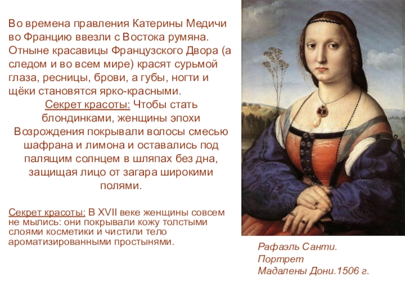 Секрет красоты: Чтобы стать блондинками, женщины эпохи Возрождения покрывали волосы смесью шафрана и лимона и оставались под палящим солнцем в шляпах без дна, защищая лицо от загара широкими полями.