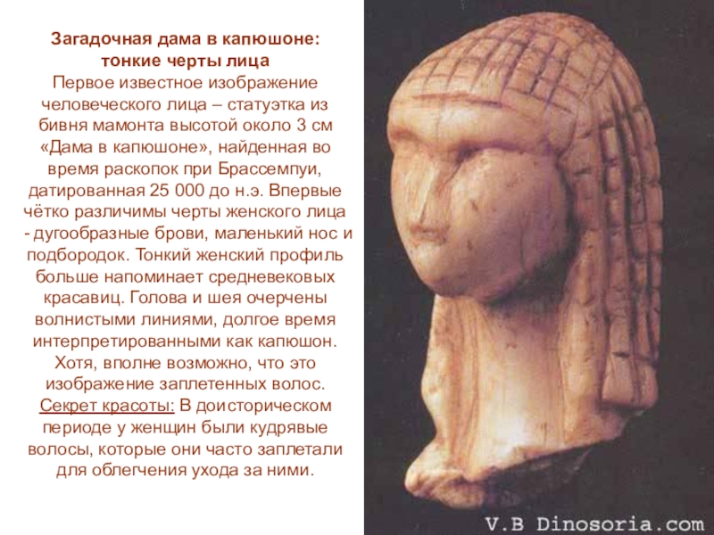 лица – статуэтка из бивня мамонта высотой около 3 см «Дама в капюшоне», найденная во время раскопок при Брассемпуи, датированная 25 000 до н.э. Впервые чётко различимы черты женского лица - дугообразные брови, маленький нос и подбородок. Тонкий женский профиль больше напоминает средневековых красавиц. Голова и шея очерчены волнистыми линиями, долгое время интерпретированными как капюшон. Хотя, вполне возможно, что это изображение заплетенных волос.