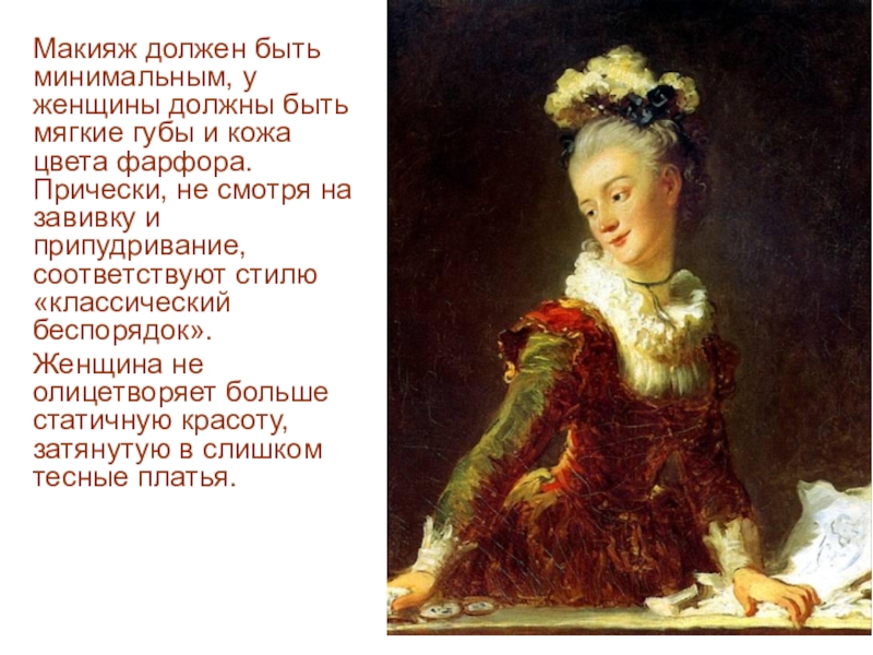 Слайд 44Макияж должен быть минимальным, у женщины должны быть мягкие губы и
