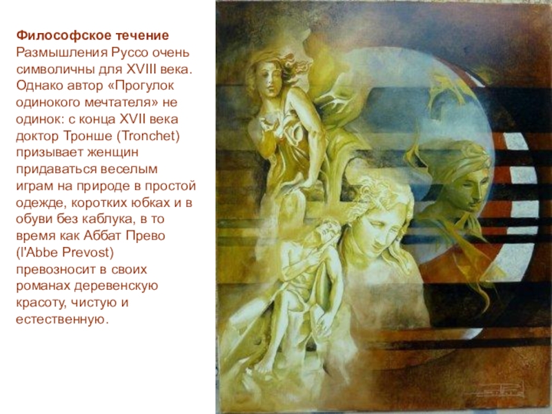 одинокого мечтателя» не одинок: с конца XVII века доктор Тронше (Tronchet) призывает женщин придаваться веселым играм на природе в простой одежде, коротких юбках и в обуви без каблука, в то время как Аббат Прево (l'Abbe Prevost) превозносит в своих романах деревенскую красоту, чистую и естественную.