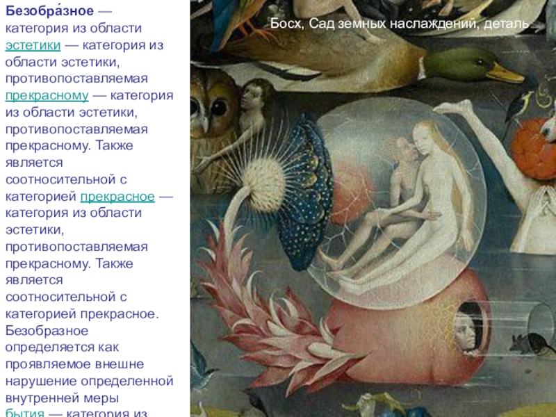 области эстетики, противопоставляемая прекрасному — категория из области эстетики, противопоставляемая прекрасному. Также является соотносительной с категорией прекрасное — категория из области эстетики, противопоставляемая прекрасному. Также является соотносительной с категорией прекрасное. Безобразное определяется как проявляемое внешне нарушение определенной внутренней меры бытия — категория из области эстетики, противопоставляемая прекрасному. Также является соотносительной с категорией прекрасное. Безобразное определяется как проявляемое внешне нарушение определенной внутренней меры бытия. Само по себе слово «безобразное» означает «отсутствие образа», то есть нечто хаотичное и бесформенное: психологическое понятие, производное от деструкции — категория из области эстетики, противопоставляемая прекрасному. Также является соотносительной с категорией прекрасное. Безобразное определяется как проявляемое внешне нарушение определенной внутренней меры бытия. Само по себе слово «безобразное» означает «отсутствие образа», то есть нечто хаотичное и бесформенное: психологическое понятие, производное от деструкции или инстинкта смерти.