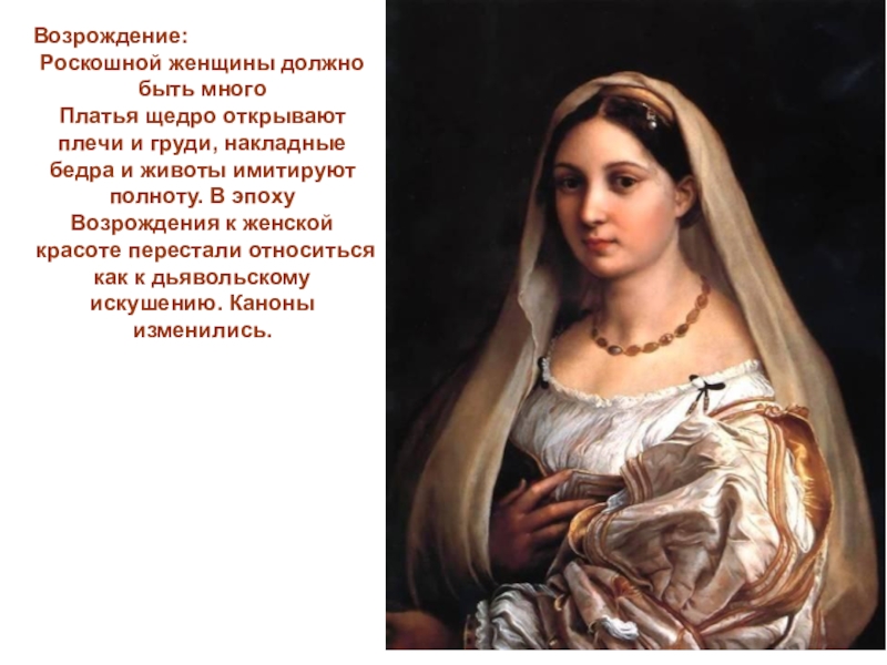 бедра и животы имитируют полноту. В эпоху Возрождения к женской красоте перестали относиться как к дьявольскому искушению. Каноны изменились.