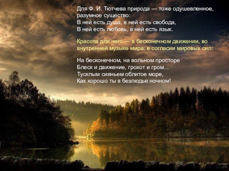 Для Ф. И. Тютчева природа — тоже одушевленное, разумное существо: