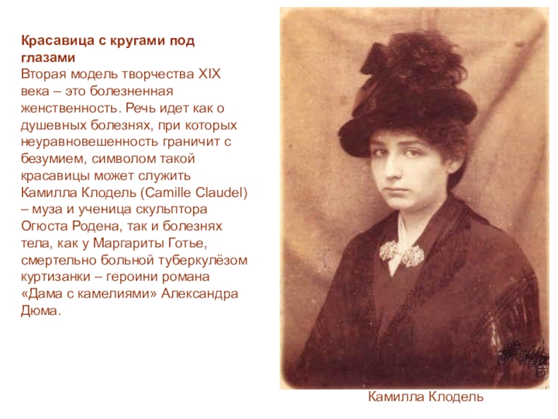 болезненная женственность. Речь идет как о душевных болезнях, при которых неуравновешенность граничит с безумием, символом такой красавицы может служить Камилла Клодель (Camille Claudel) – муза и ученица скульптора Огюста Родена, так и болезнях тела, как у Маргариты Готье, смертельно больной туберкулёзом куртизанки – героини романа «Дама с камелиями» Александра Дюма.