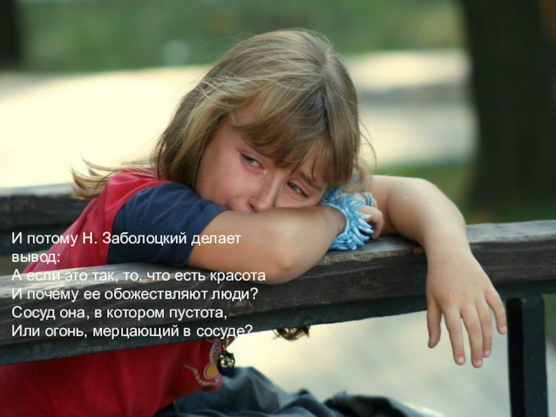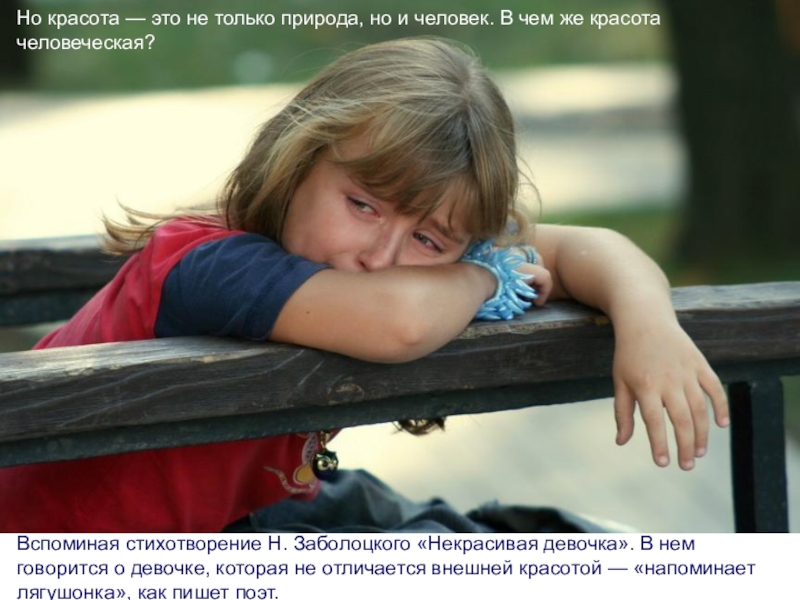 Вспоминая стихотворение Н. Заболоцкого «Некрасивая девочка». В нем говорится о девочке, которая не отличается внешней красотой — «напоминает лягушонка», как пишет поэт.