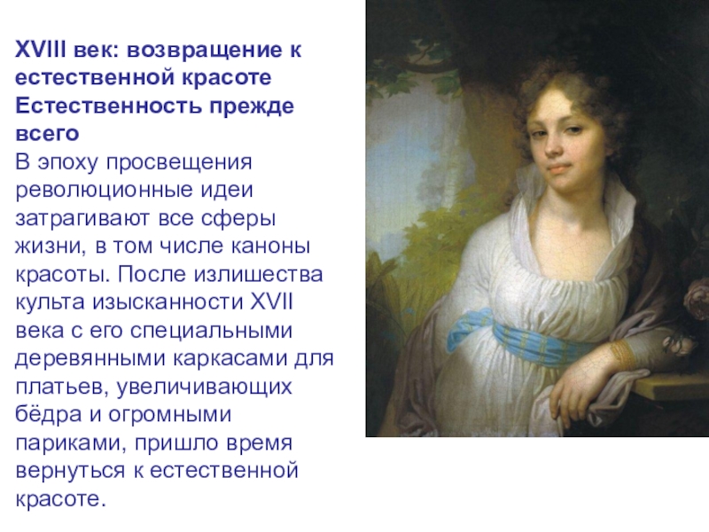 идеи затрагивают все сферы жизни, в том числе каноны красоты. После излишества культа изысканности XVII века с его специальными деревянными каркасами для платьев, увеличивающих бёдра и огромными париками, пришло время вернуться к естественной красоте.