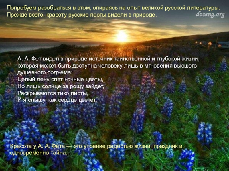 Красота у А. А. Фета — это упоение радостью жизни, праздник и одновременно тайна.