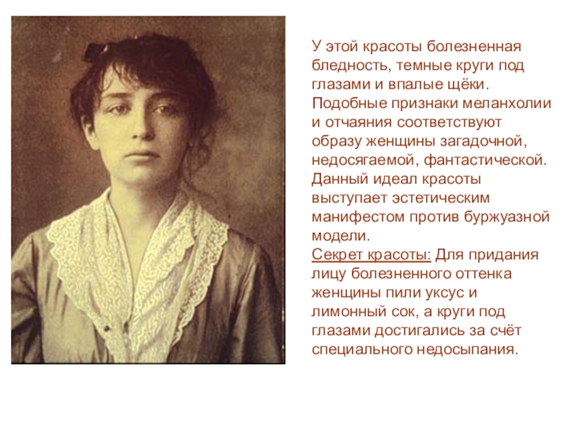 щёки. Подобные признаки меланхолии и отчаяния соответствуют образу женщины загадочной, недосягаемой, фантастической. Данный идеал красоты выступает эстетическим манифестом против буржуазной модели.