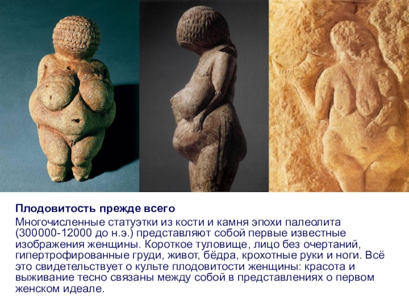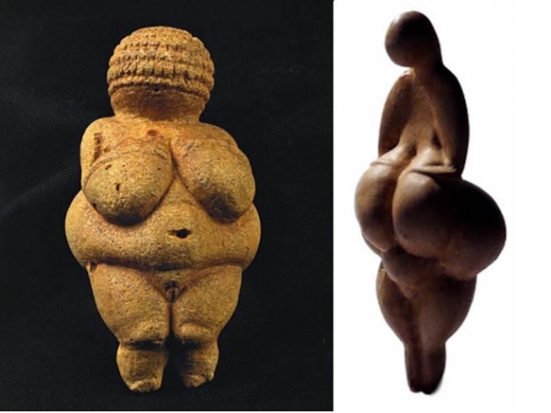 до н.э.) представляют собой первые известные изображения женщины. Короткое туловище, лицо без очертаний, гипертрофированные груди, живот, бёдра, крохотные руки и ноги. Всё это свидетельствует о культе плодовитости женщины: красота и выживание тесно связаны между собой в представлениях о первом женском идеале.