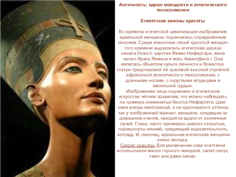 изображения идеальной женщины подчинялись определённым канонам. Среди известных своей красотой женщин того времени выделалась египетская царица начала Нового царства Яхмес-Нефертари, жена своего брата Яхмеса и мать Аменофиса I. Она являлась объектом культа личности и божества: статуи представляют её красивой высокой стройной африканкой атлетического телосложения, с длинными ногами, с округлыми ягодицами и маленькой грудью.