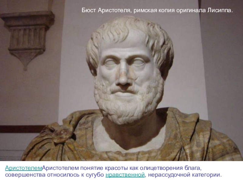 АристотелемАристотелем понятие красоты как олицетворения блага, совершенства относилось к сугубо нравственной,