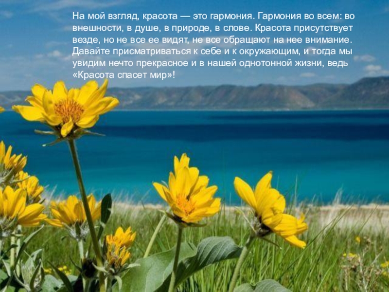 внешности, в душе, в природе, в слове. Красота присутствует везде, но не все ее видят, не все обращают на нее внимание. Давайте присматриваться к себе и к окружающим, и тогда мы увидим нечто прекрасное и в нашей однотонной жизни, ведь «Красота спасет мир»!