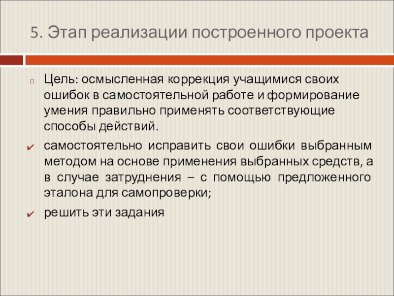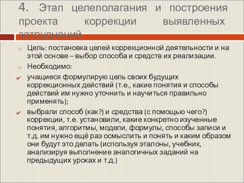 учащиеся формулирую цель своих будущих коррекционных действий (т.е., какие понятия и способы действий им нужно уточнить и научиться правильно применять);