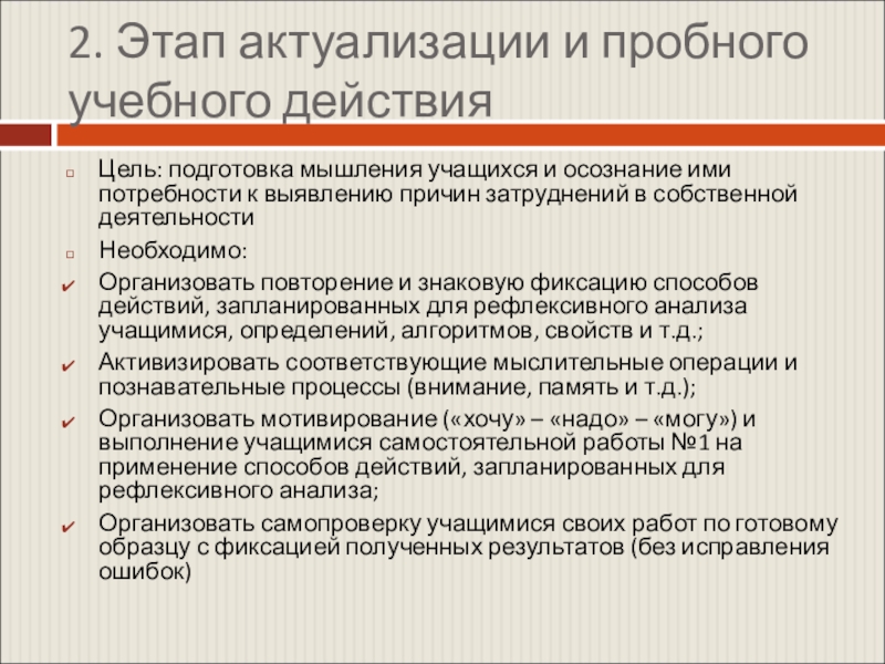 Слайд 62. Этап актуализации и пробного учебного действия