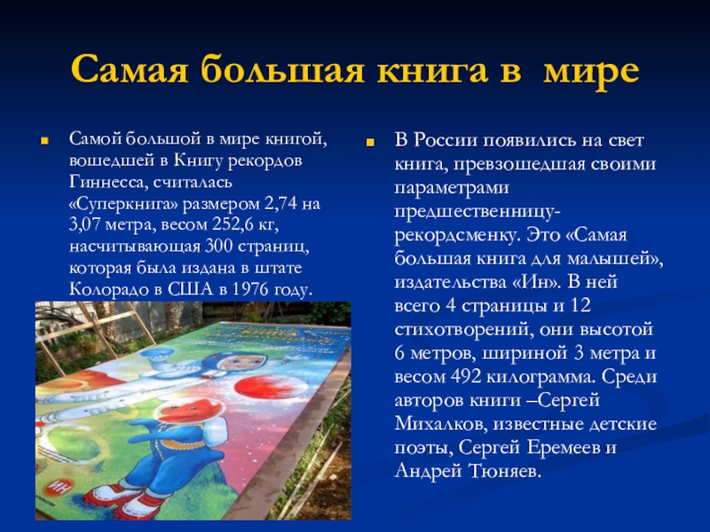 В России появились на свет книга, превзошедшая своими параметрами предшественницу-рекордсменку. Это «Самая большая книга для малышей», издательства «Ин». В ней всего 4 страницы и 12 стихотворений, они высотой 6 метров, шириной 3 метра и весом 492 килограмма. Среди авторов книги –Сергей Михалков, известные детские поэты, Сергей Еремеев и Андрей Тюняев.