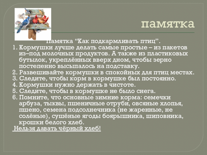 6. Помните, что основные зимние корма: семечки арбуза, тыквы, пшеничные отруби, овсяные хлопья, пшено, семена подсолнечника (не жаренные, не солёные), сушёные ягоды боярышника, шиповника, крошки белого хлеб.