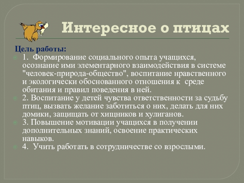 Проект «Интересное о птицах» позволяет не только закрепить на практике теоретические знания учащихся о роли птиц в жизни человека, но и заинтересовать всех детей класса своими идеями и делами, чтобы сохранить и приумножить количество птиц в наших дворах, районе, городе и, в целом, в природе.