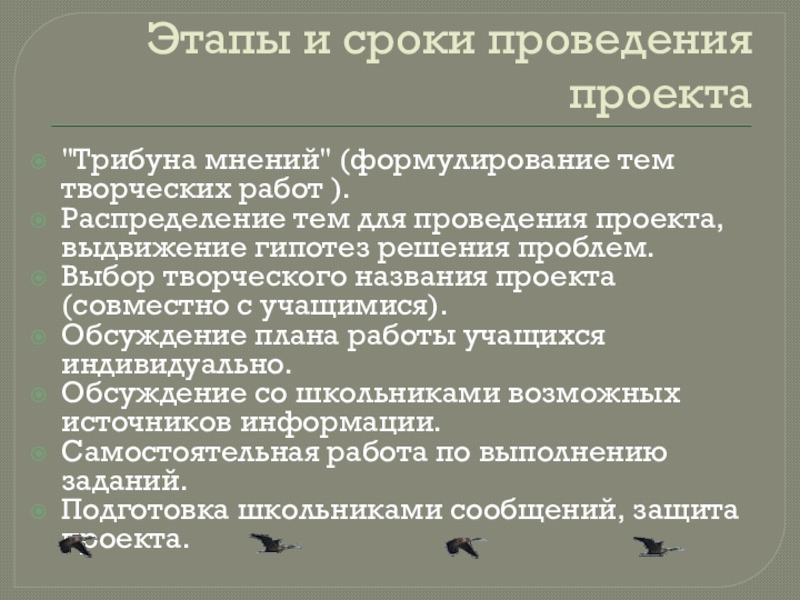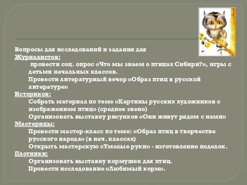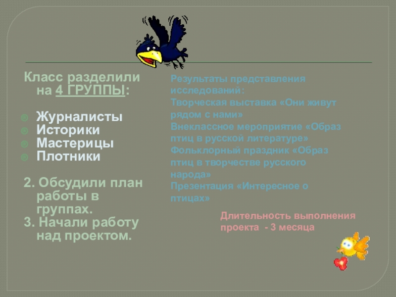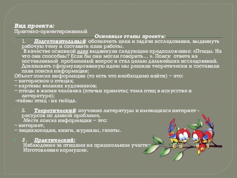 В качестве основной идеи выдвинули следующее предположение: «Птицы. На что они способны? Если бы они могли говорить… ». Поиск ответа на поставленный проблемный вопрос и стал целью дальнейших исследований. Доказывать сформулированную идею мы решили теоретически и составили план поиска информации: