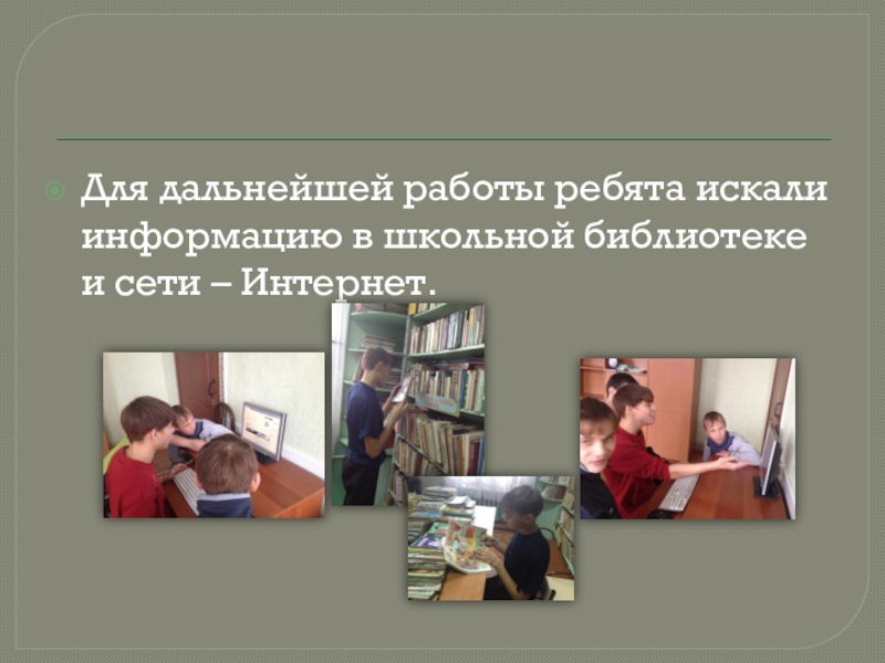 Слайд 10Для дальнейшей работы ребята искали информацию в школьной библиотеке и сети