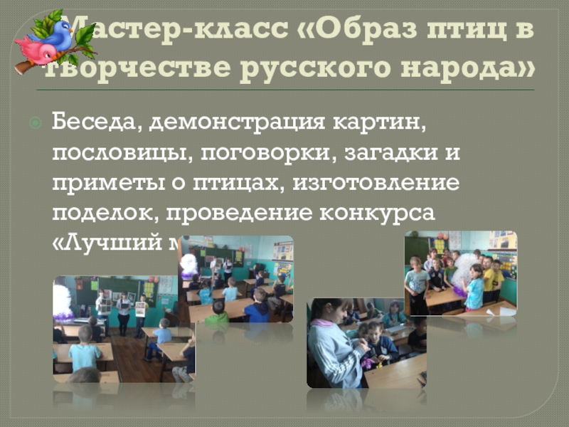 Провести мастер-класс по теме: «Образ птиц в творчестве русского народа» (в нач. классах)