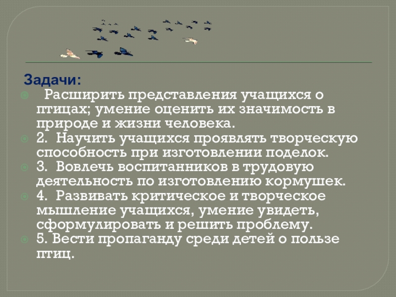 Расширить представления учащихся о птицах; умение оценить их значимость в