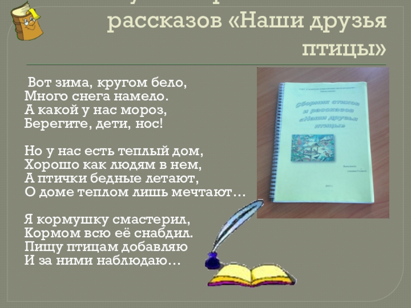 Слайд 13Выпуск сборника стихов и рассказов «Наши друзья птицы»