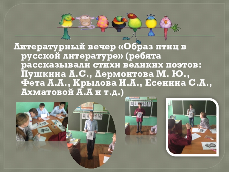 Слайд 11Литературный вечер «Образ птиц в русской литературе» (ребята рассказывали стихи великих