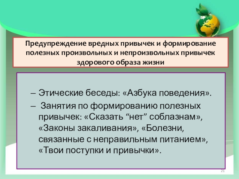 Занятия по формированию полезных привычек: «Сказать “нет” соблазнам», «Законы закаливания», «Болезни, связанные с неправильным питанием», «Твои поступки и привычки».