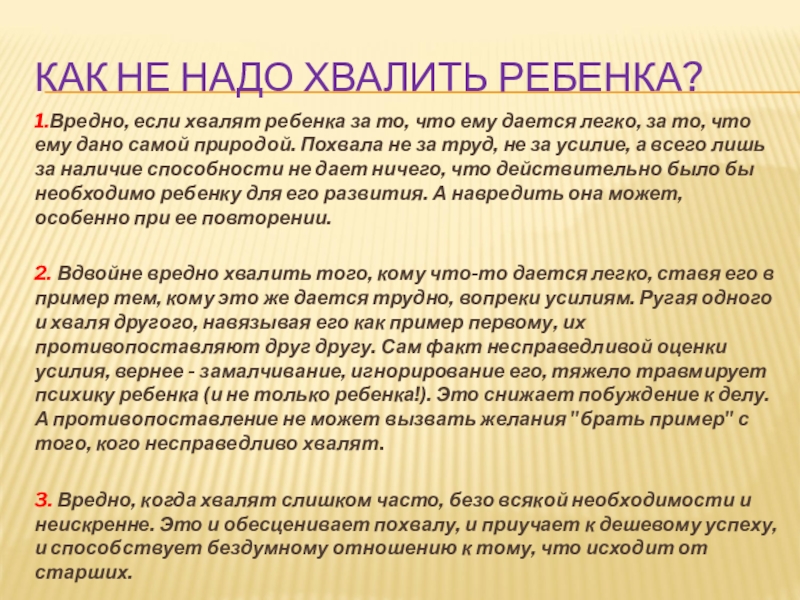 ему дается легко, за то, что ему дано самой природой. Похвала не за труд, не за усилие, а всего лишь за наличие способности не дает ничего, что действительно было бы необходимо ребенку для его развития. А навредить она может, особенно при ее повторении.