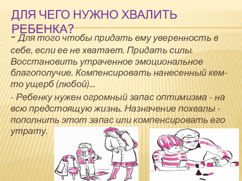 - Ребенку нужен огромный запас оптимизма - на всю предстоящую жизнь. Назначение похвалы - пополнить этот запас или компенсировать его утрату.
