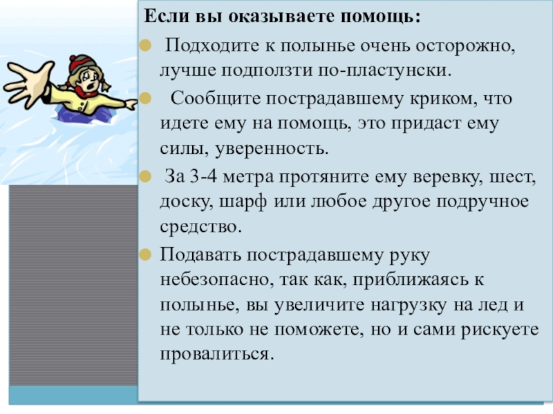 Если вы оказываете помощь: Подходите к полынье очень осторожно, лучше подползти по-пластунски.  Сообщите пострадавшему криком, что идете