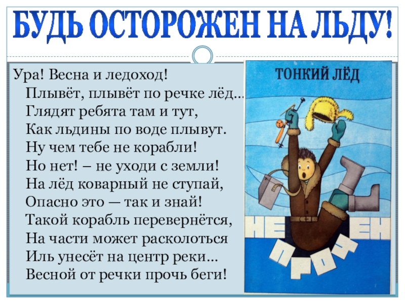 БУДЬ ОСТОРОЖЕН НА ЛЬДУ!Ура! Весна и ледоход! Плывёт, плывёт по речке лёд… Глядят ребята там и тут,